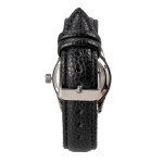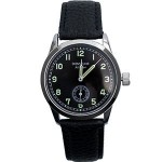 These particular watches come in a smart black presentation box complete with sculpted recess to accept and protect the watch. Each watch has as a black grained PU leather wrist strap (a little more texture than what is shown in the pictures) with a traditional silver coloured metal buckle. The straps are held in place with spring bars so the straps can easily be replaced if desired. The watch face in encased in a silver coloured stainless steel watch housing. There are the traditional tool notches around the back of the face as well as the stamping 'Wasserdicht Stahlboden', which translates as 'waterproof steel base' although the watch by today's standards is water resistant to 3 ATM. The black watch face is lined around the edge with large easy to read luminous numbering. The main hour and minute hands are also luminous so can easily be read in low light conditions. Beneath the main hands is a smaller dial with a single hand which is used to record seconds. The watches are all battery powered with a Quartz movement with a small dial on the side to change the time if required.