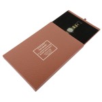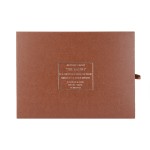 A flat brown presentation box with silver text.