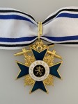 This example of the 2nd class neck cross award consists of a double sided gilt and enamel badge measuring 50mm across, surmounted by a pair of gilt metal swords and suspension loop. It is supplied complete with a length of the correct ribbon.