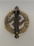 Originally instituted in November 1933 by Ernst Roehm and sanctioned by Hitler in 1935, the Sturmabteilung Sports Badge was awarded in three classes as a recognition of proficiency in sports and military sports exercises and was awarded to members of both the S.A. and S.S. This is the 2nd version of the badge and measures 47mm x 57mm with the usual design depicting an upturned sword on a swastika surrounded by an oakleaf wreath. The reverse has an inscription in German which translates as 'Property of the S.A. Sports badge main office'. This Bronze grade example is die struck from brass with an antique bronze finish. Complete with the correct German style hinge.