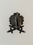 With correct loop fitting and makers marks stamped in the reverse. This nice quality version has the correct double side swords and has an antiqued silver finish.