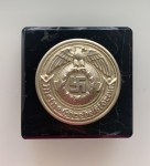 Meine Ehre Heist Treue desk ornament Paperweight. This attractive heavy paperweight takes the form of a nice silver plated S.S. Officers buckle centre piece mounted on a black marble base. The base measures approximately 65 x 65 x 30mm